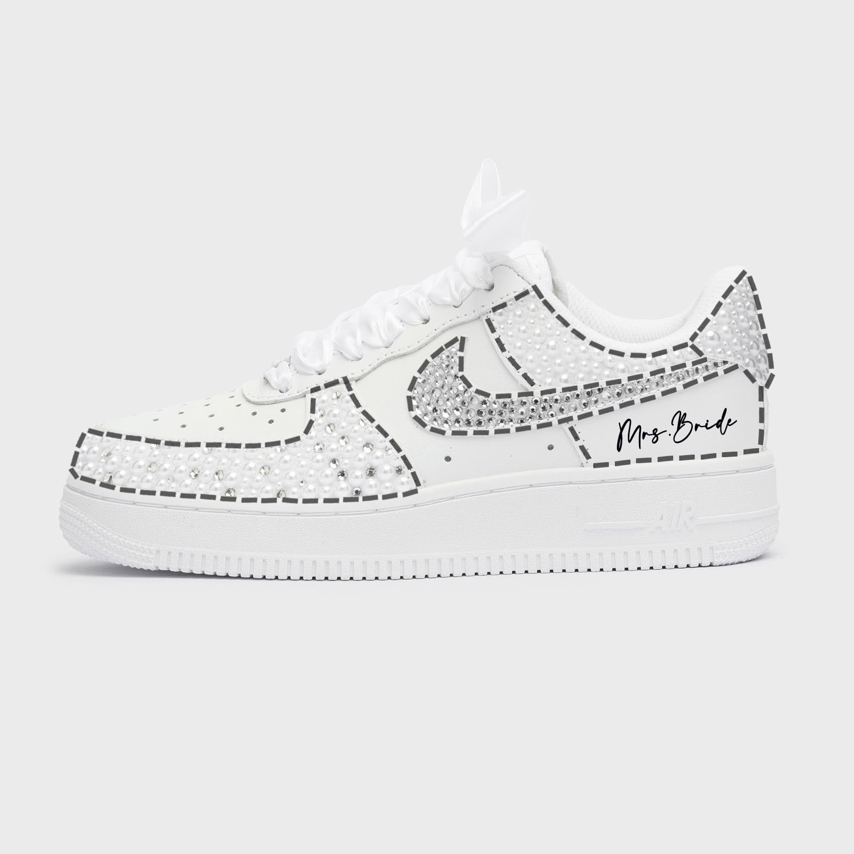 - 4 Swooshes Embellished: Full glamour with all four swooshes adorned in crystals or pearls. Includes personalized touches, satin laces, and a complimentary dust bag for protection.